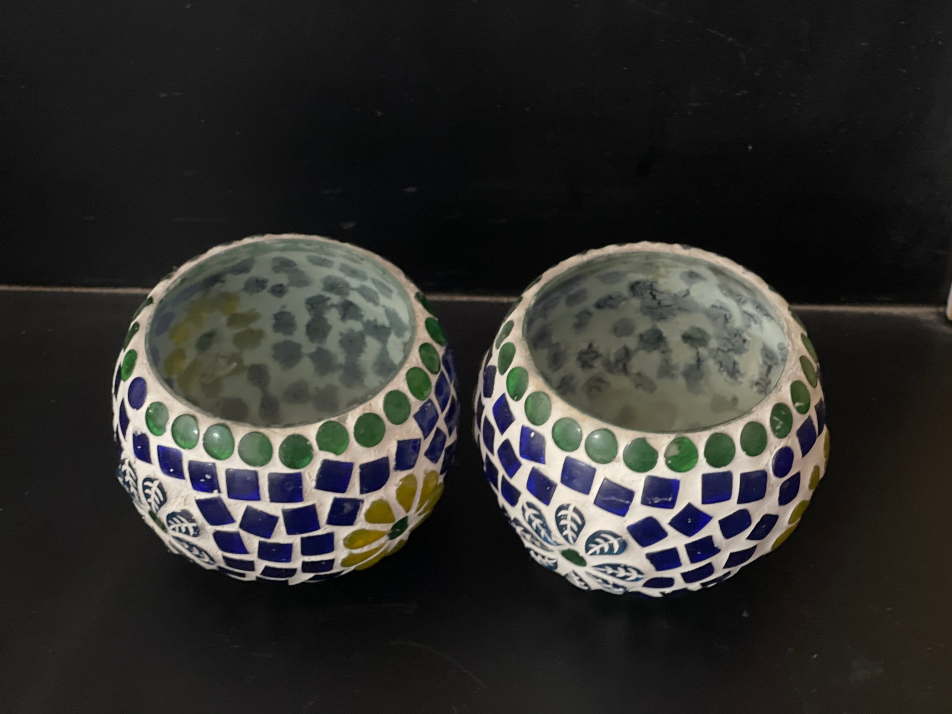 This set of vibrant, hand-painted mosaic candle holders features delicate floral and geometric designs in blue, green, and yellow. A stunning way to add warmth and color to any space.